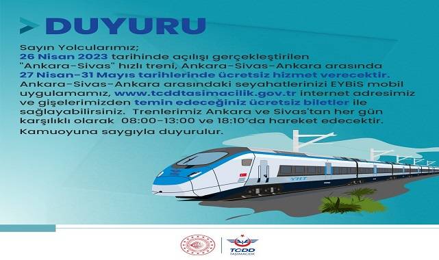 26 Nisan 2023 tarihinde açılışı gerçekleştirilen "Ankara-Sivas" hızlı treni, Ankara-Sivas-Ankara arasında 27 Nisan-31 Mayıs tarihlerinde ücretsiz hizmet verecektir. Kamuoyuna saygıyla duyurulur.''