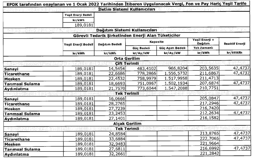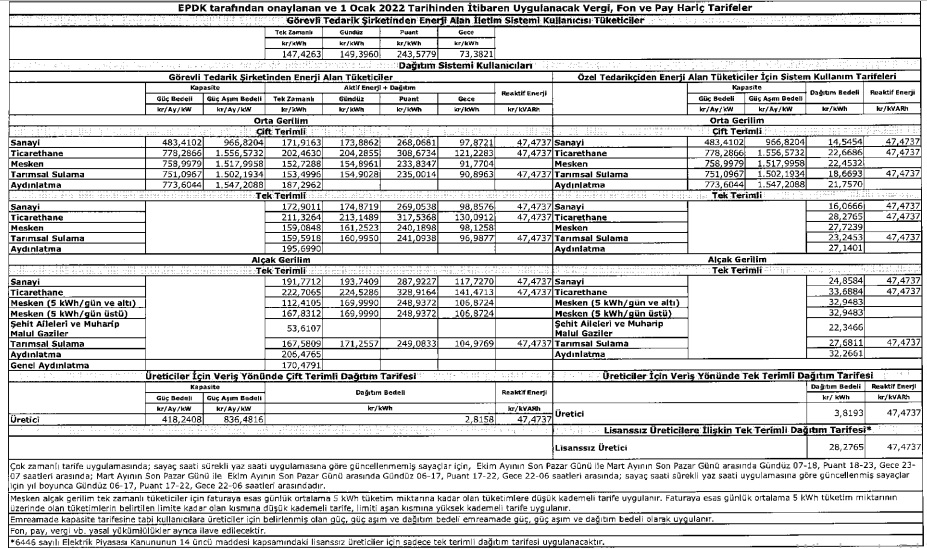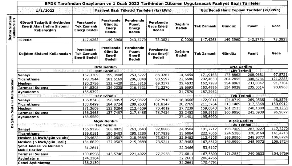 Cevap: EPDK, 1 Ocak 2022 dönemi itibariyle geçerli olacak elektrik birim fiyatlarını açıkladı (Konut, Sanayi, Ticarethane ve diğer abone grupları için). EPDK'nın açıkladığı yeni fiyatlar, 31 Mart 2022 tarihine kadar geçerli olacak (3 aylık dönem için).Önemli bir ayrıntıda, 1 Ocak 2022 itibariyle geçerli olan düşük fiyat, Aralık 2021 dönemine göre zamlanarak uygulamaya girdi.