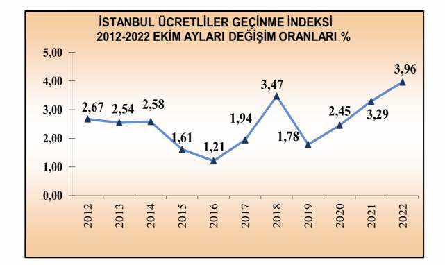- Perakende fiyatları yansıtan İstanbul Ücretliler Geçinme İndeksi, 2022 Ekim ayında da % 3,96 oranında artış gösterdi.