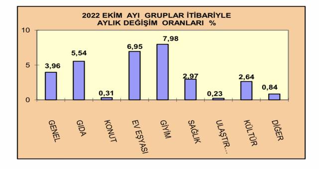 - Ekim 2022’de Giyim Harcamalarında yüzde 7,98, Ev Eşyası Harcamalarında yüzde 6,95, Gıda Harcamalarında yüzde 5,54, Sağlık ve Kişisel Bakım Harcamalarında yüzde 2,97, Kültür Eğitim ve Eğlence Harcamalarında yüzde 2,64, Diğer Harcamalarda yüzde 0,84, Konut Harcamalarında yüzde 0,31, Ulaştırma ve Haberleşme Harcamalar grubunda yüzde 0,23 artış izlenmiştir.