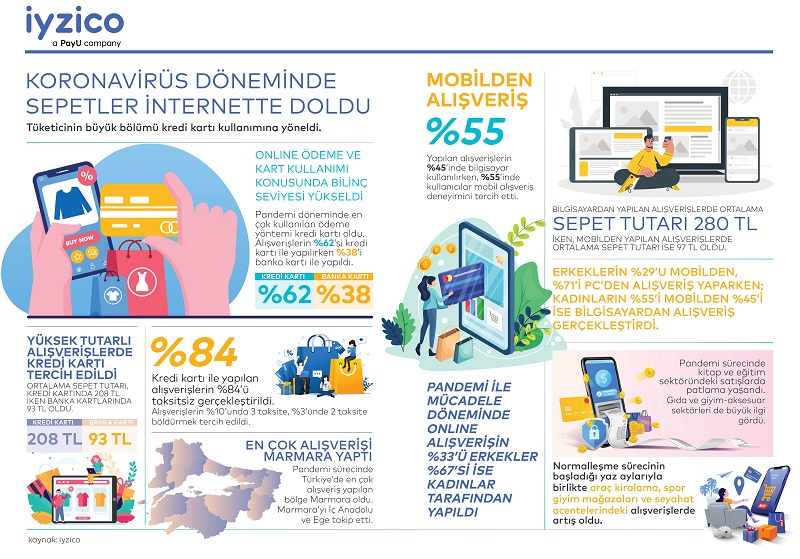 'Koronavirüsün ülkemizde etkisini göstermeye başladığı Mart ayından günümüze kadarki 6 aylık dönemde, vatandaşlarımızın online alışveriş davranışlarıyla ilgili bir infografik' (iyzico hazırladı).