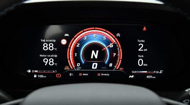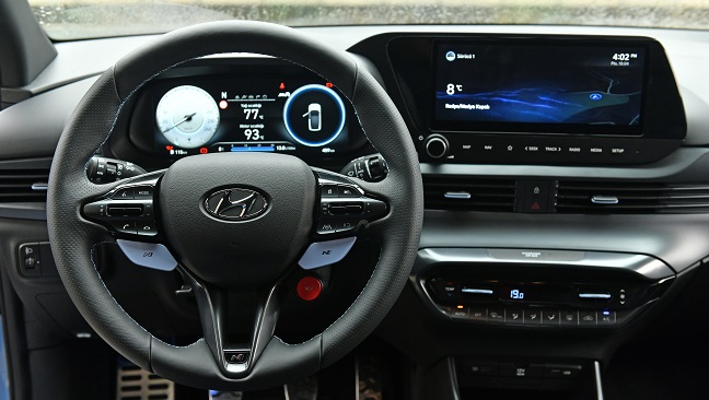 Heyecan verici otomobilin iç mekanındaysa performans kokan donanım öğelerine yer verilmiş. Bir hot hatch otomobilde olması gereken tüm unsurları barındıran i20 N, nubuk ve deri karışımı N logolu koltuklara sahip. Güncel modelden farklı olarak; üç kollu N direksiyon simidi, N vites topuzu ve N pedal takımıyla üretilen aracın tamamen siyah kokpitinde mavi renkli ambiyans ortam aydınlatması da var. Hyundai i20 N, 10.25 inçlik dijital gösterge ve yine 10.25 inç AVN dokunmatik ekranlı multimedya özelliğine sahip. Gösterge tablosunda performans değerleri anlık olarak da takip edilebiliyor. Bu ekranda yağ ve motor sıcaklığı haricinde vites değişim zamanını gösteren uyarı ışığı, G metre, turbo basıncı, beygir gücü ve tork değerleri gibi sürüş bilgileri var. i20 N, anahtarsız çalıştırma, dijital klima, Apple CarPlay, Android Auto ve kablosuz şarj gibi özelliklere de sahip. Bunlara ek olarak, müzik keyfi için de subwooferlı BOSE ses sistemi bulunuyor.