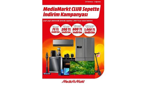 - Yıl genelinde ve özel günlerde tüketicilere uygun fiyat ve ödeme koşullarıyla cazip kampanyalar düzenleyen MediaMarkt, çeşitli avantaj ve hizmetler sunduğu sadakat programı CLUB üyelerine özel kampanya başlattı. Buna göre 1 Ağustos Pazartesi gününe dek sürecek kampanya kapsamında buzdolabından bilgisayara, telefondan hoparlöre çeşitli ürünlerin yer aldığı sepetlerde 1.000 TL’ye varan indirimler sunulacak.