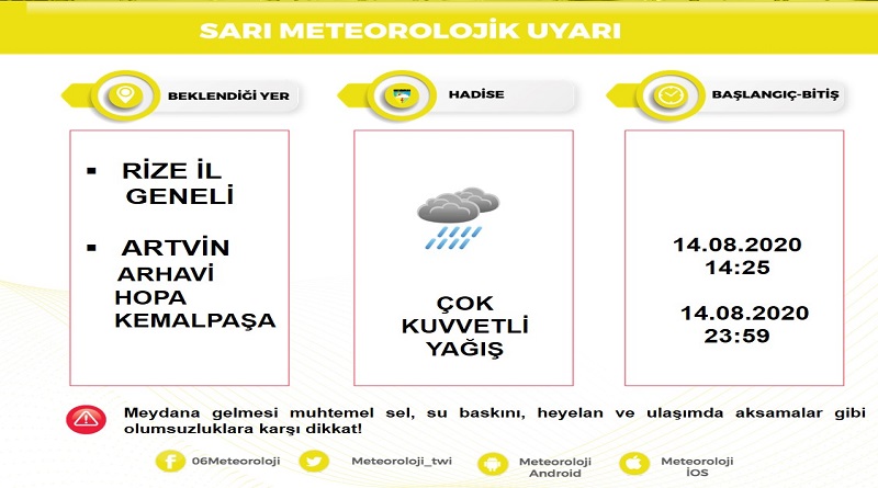 Karadeniz bölgesi ve özellikle Trabzon - Rize - Artvin'de etkili olan kuvvetli yağışlar için, 'SARI Uyarı' geldi. Meteoroloji Genel Müdürlüğü (MGM) Rize ve Artvin için için 'Sarı' meteorolojik uyarı yaptı (Çok Kuvvetli Yağış). İŞTE AYRINTILARTüketici TV