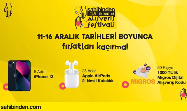 sahibinden.com, kullanmadığı eşyaları komisyonsuz satışa çıkararak, ihtiyacı olan ürünleri almak isteyenleri İkinci El Alışveriş Festivali’nde buluşturuyor. 11 - 16 Aralık tarihleri arasında devam edecek olan İkinci El Alışveriş Festivali’nde katılımcıları ilan verdikçe onlarca hediyeden birini kazanma şansı, seçili kategorilerde geçerli %50 Hizmet Bedeli indirimi, sosyal medyada severek takip ettikleri isimlerin ürünlerine sahip olma fırsatı bekliyor. Türkiye’de alıcı ve satıcıların sevilen buluşma noktası olan sahibinden.com’un İkinci El Alışveriş Festivali başladı. Sosyal medyanın sevilen isimlerinden Cansu Dengey, Hakan Kütahya, İrem Akdemir, Merve Özkaynak, Umut Eker ve daha birçok ismin ürünlerini satışa çıkaracağı İkinci El Alışveriş Festivali 11-16 Aralık tarihleri arasında gerçekleşecek. Ayrıca “İkinci El & Sıfır Alışveriş Kategorisi”nde en az 5 ilan vererek çekilişe başvuran kullanıcılar; 5 adet iPhone 13, 25 adet İkinci Nesil Apple Airpod Kulaklık veya 50 adet 1.000 TL’lik Migros Dijital Alışveriş Kodu hediyelerinden birini kazanma şansı yakalıyor. 2 milyonun üzerinde aktif ilanın yer aldığı “İkinci El & Sıfır Alışveriş Kategorisi”nde ilan verilen eşyaların Giyim, Anne Bebek veya Ev Dekorasyonu alt kategorilerinde olması durumunda çekiliş hakkı ikiye katlanıyor. Çekilişi kazanan şanslı isimlerin listesi, 28 Aralık 2022 tarihinde sahibinden.com’da yayınlanacak.