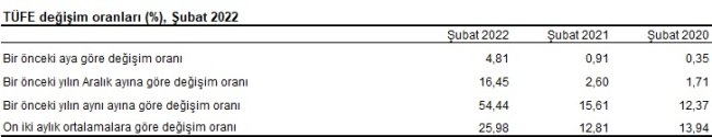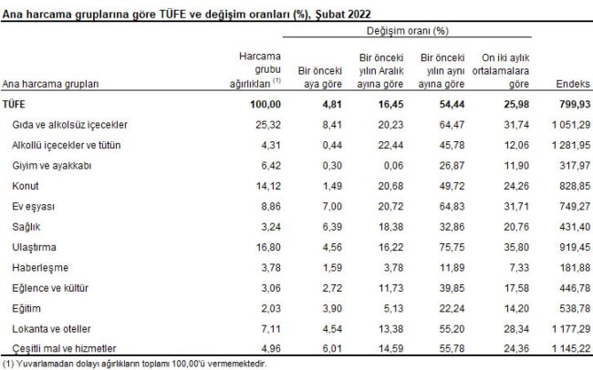 TÜFE'de (2003=100) 2022 yılı Şubat ayında bir önceki aya göre %4,81, bir önceki yılın Aralık ayına göre %16,45, bir önceki yılın aynı ayına göre %54,44 ve on iki aylık ortalamalara göre %25,98 artış gerçekleşti.