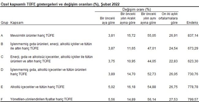 İşlenmemiş gıda ürünleri, enerji, alkollü içkiler ve tütün ile altın hariç TÜFE'de 2022 yılı Şubat ayında bir önceki aya göre %3,87, bir önceki yılın Aralık ayına göre %11,65, bir önceki yılın aynı ayına göre %47,01 ve on iki aylık ortalamalara göre %24,54 artış gerçekleşti.