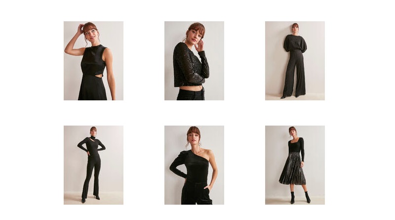 Yılbaşına özel ışıltılı kombinler sunan koleksiyonda saten dokular ve payet işlemeler de öne çıkıyor. Dokularıyla parlayan ürünlerde formların yenilikçi yorumlarını görüyoruz.
